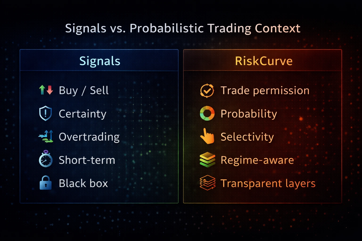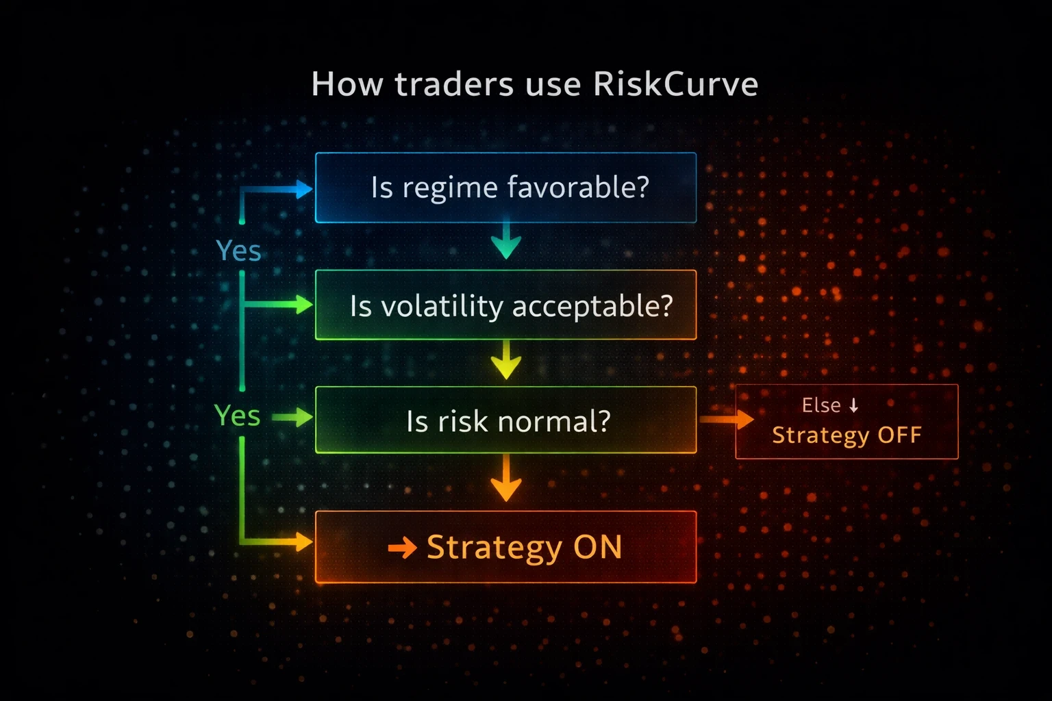 RiskCurve delivers probability-based regime, volatility, and risk context — allowing traders to decide when not to trade.